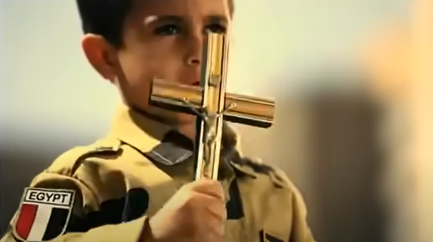 À la suite de la révolution de 2011 et des violences religieuses ciblant les coptes – les chrétiens d’Égypte –, des acteurs et actrices égyptien·nes ont donc tenté de mobiliser la population en sortant cette chanson, dont le refrain signifie « non et mille fois non à tous les ennemis de la vie ». Dans le clip, ces stars du cinéma se présentent devant un bâtiment prestigieux, si mal éclairé que je ne parviens pas à l’identifier précisément, aux côtés d’une chorale chantant des paroles nationalistes avec une grande gravité. Les habits sont sobres, les individus peu maquillés, et les visages attristés. Le message est sans ambiguïté : « L’Égypte est grande et détient la clé de la vie », « chrétiens ou musulmans, votre sang est égyptien, et lorsque la nation vous appelle, il faut répondre présent ». Les acteurs se répondent les uns aux autres, en chantant chacun tour à tour un segment de phrase. Là encore, l’intention est claire : nous sommes complémentaires, et en chantant ensemble, nous incarnons le rêve d’une nation unifiée. « Masr Moftah Al Haya » s’achève par cette phrase prononcée en symbiose : « Les églises, les mosquées, tous les Égyptiens, notre amour vous est destiné ».